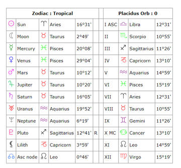 Aries Sun, Taurus Moon, Libra Rising, Pisces Venus + Mercury. Taurus/Venus Dominant.